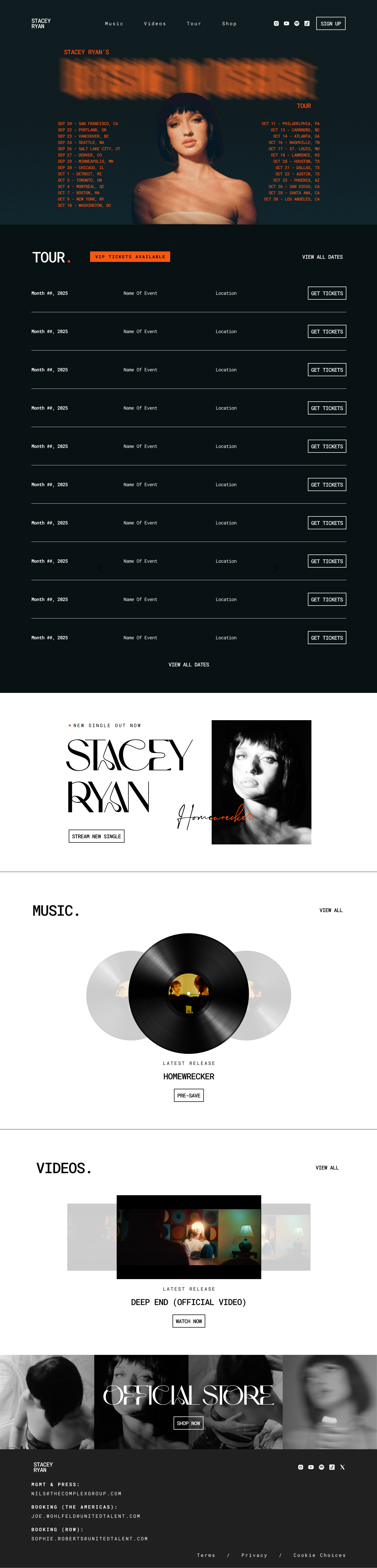 We redesigned Stacey Ryan’s website into a cinematic, vintage magazine-style hub that elevated her brand and streamlined fan access to music, tour dates, and merch.